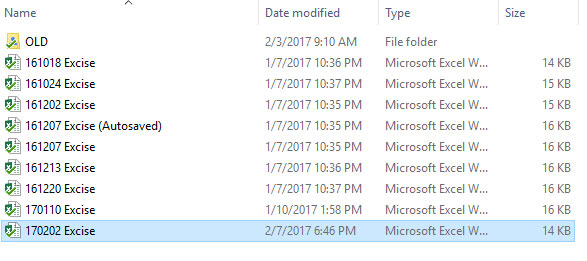 Open the most recent Excise Record. The date should be recorded at the beginning of the file e.g. 20170217 “Filename”