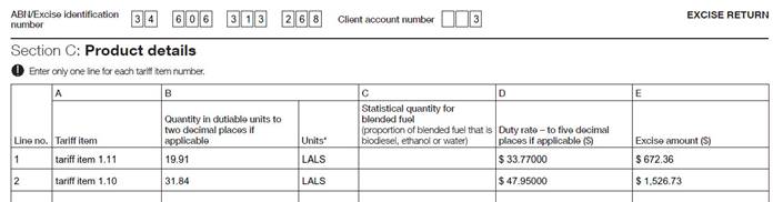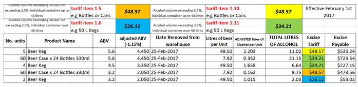 Excise Payable = This amount is Total Litres of Alcohol multiplied by the Excise Tariff e.g. 11.02 x $48.57 = $535.24